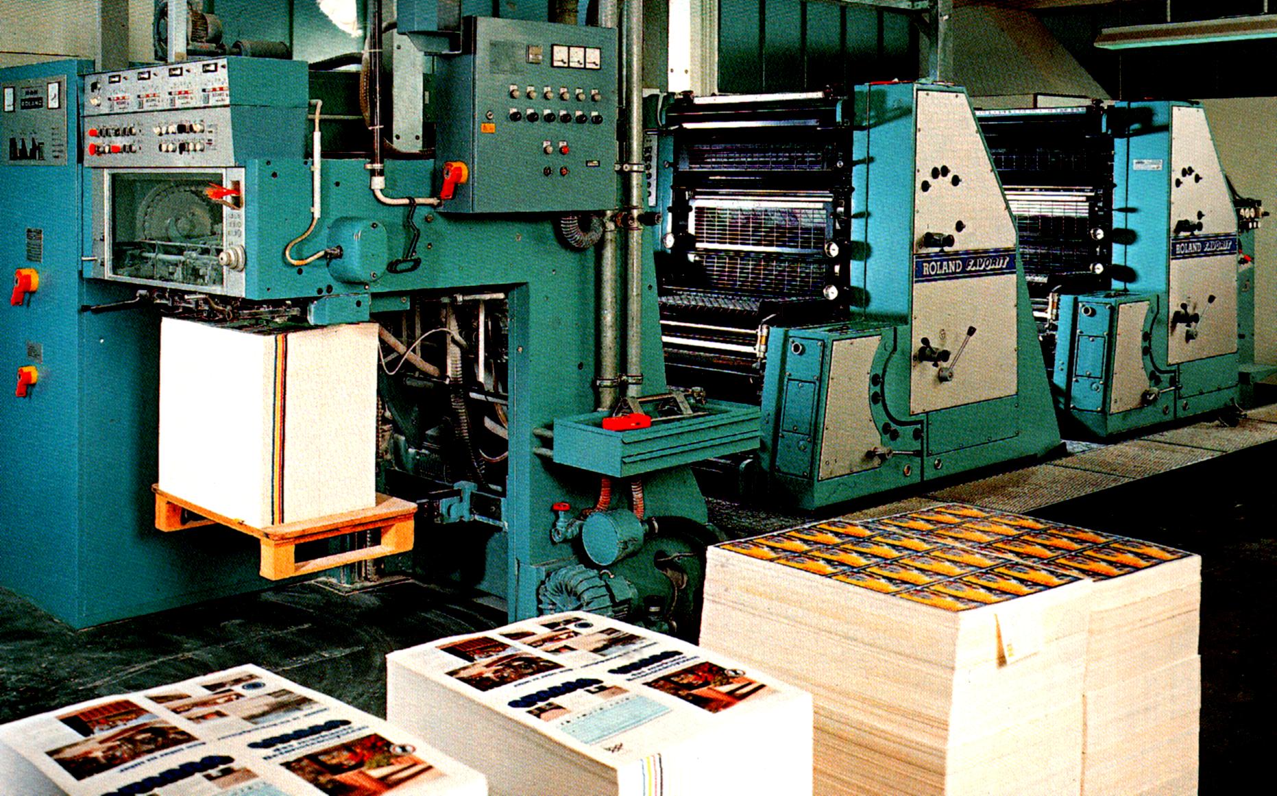 Den steigenden Auflagen und der Trend zu mehr Farbe wurde 1992 mit einer größeren und schnelleren Rolle Rechnung getragen, die es auch ermöglichte, noch dünneres Papier zu verarbeiten. Lag die Grenze in der Vergangenheit bei 65 gr. Konnten jetzt bis zu 45 gr. Papiere problemlos bedruckt werden. 1987 kamen in der Druckvorstufe, welche die Satz-, Repro- und Druckformherstellung beinhalten, die ersten DTP-Programme und Geräte auf den Markt. Diese Geräte waren Massenprodukte und für 10.000,-- DM konnte sie auf einfache Art das gleiche herstellen wie branchenspezifische Fotosatzgeräte, die bis zu 200.000,-- DM kosteten. Seit 1988 wurde auch im Hause Zielfleisch auf die DTP-Schiene gesetzt und die herkömmliche Satzherstellung ging mehr und mehr zurück. Geeignete DTP-Programme und Scanner ermöglichten einen preiswerten Einstieg in die Reproherstellung und werden seit 1990 im Hause vollständig erledigt. Ein großer Einschnitt in den Datenaustausch war das Telefax, welches seit 1984 den Datenaustausch von Manuskripten und Korrekturen innerhalb von Firmen auf einen Bruchteil der Postlaufzeit reduzierte. |